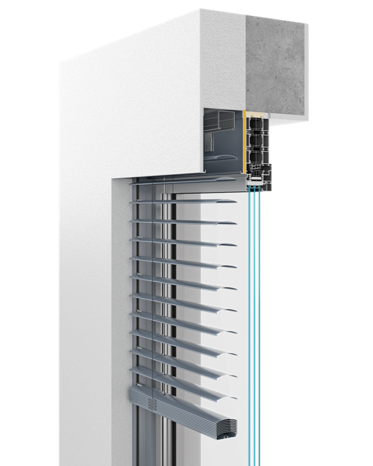 In addition to the basic variant, we offer our customers three other distinct options. The self-supporting variant was developed primarily for large glazed areas. The supporting elements of this system simultaneously serve as slat guides.